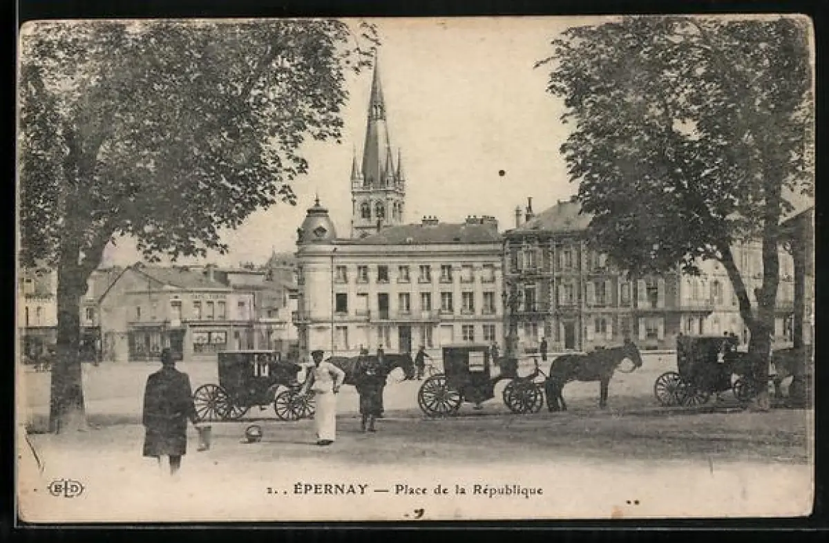 AK Épernay, Place de la République avec voitures à cheval et bâtiments historiques