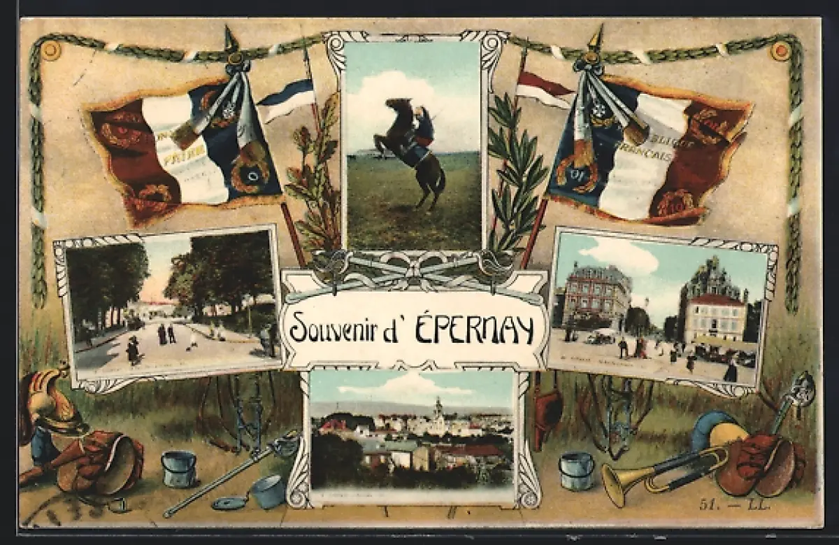 AK Épernay, Rue du Commerce, Platz, Standarten, Lanzen, Römische Helme, Trompete