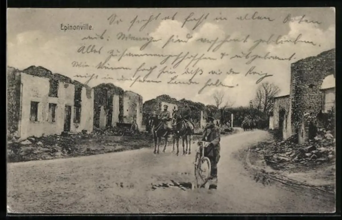AK Épinonville, Vue des ruines et des soldats à cheval sur une route