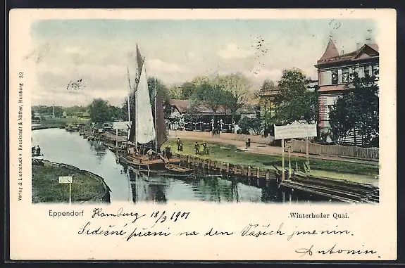 AK Eppendorf, Winterhuder Quai mit Gasthof und Segelboot