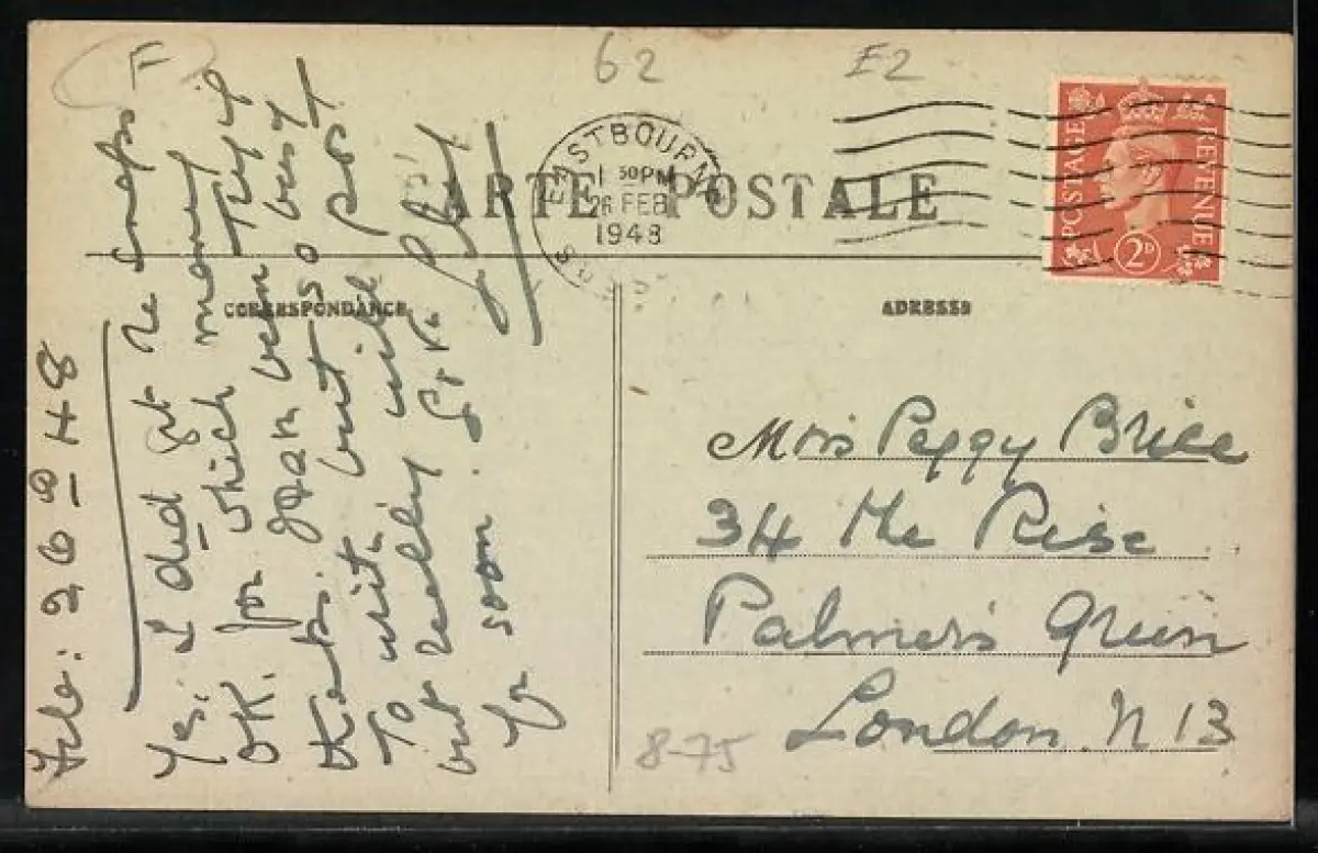 Personenbezogene Daten auf der Rückseite der Karte wurden durch blauen Textmarker unkenntlich gemacht. Die blauen Stellen sind auf die Vorderseite durchgeweicht und wirken sich negativ auf das Postkartenfoto aus