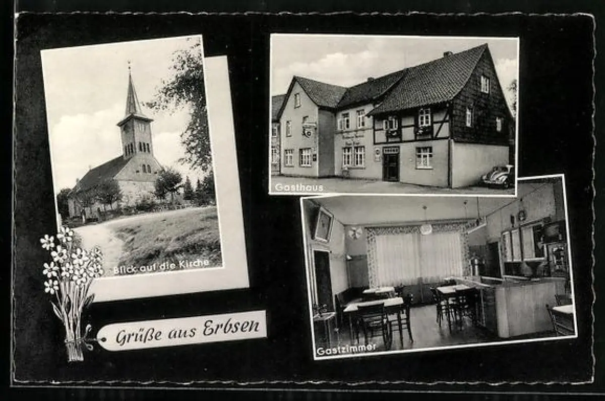 AK Erbsen, Gasthaus, Innenansicht vom Gastzimmer, Blick auf die Kirche