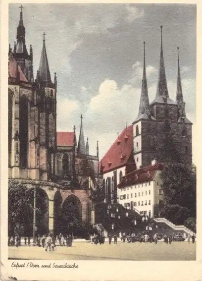 Ansichtskarte Erfurt Dom und Severikirche früher DDR-Farbdruck? Erhaltung I-II, Ecke unten links bügig und fleckig ungelaufen Druckvermerk: ohne Verlag: Straub & Fischer, Meiningen