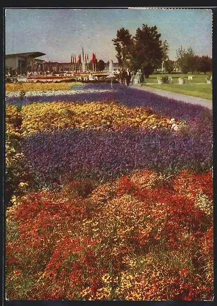 AK Erfurt, Internatinale Garten-Ausstellung iga, Sommerblumenwiese und Festgebäude