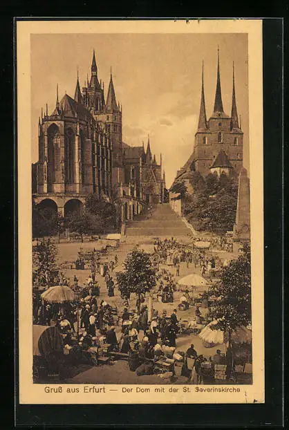 AK Erfurt, Markttreiben vor dem Dom, St. Severinskirche