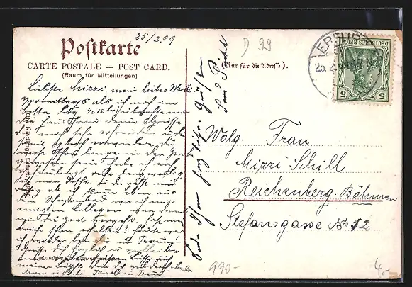 gelaufen 1909, Eckknick oben li., guter Zustand