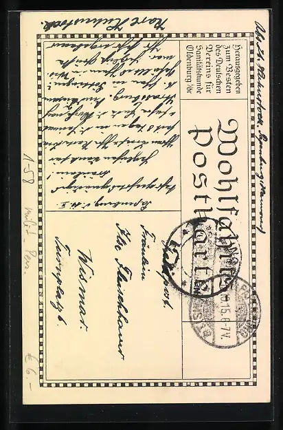 Personenbezogene Daten auf der Rückseite der Karte wurden durch blauen Textmarker unkenntlich gemacht. Die blauen Stellen sind auf die Vorderseite durchgeweicht und wirken sich negativ auf das Postkartenfoto aus