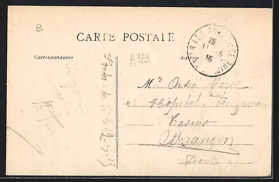 Personenbezogene Daten auf der Rückseite der Karte wurden durch blauen Textmarker unkenntlich gemacht. Die blauen Stellen sind auf die Vorderseite durchgeweicht und wirken sich negativ auf das Postkartenfoto aus