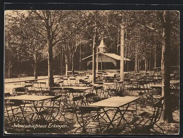 AK Erlangen, Gasthaus Waldschiesshaus, Gartenansicht mit Turmgebäude
