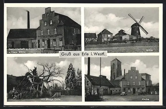 AK Erle i. Westf., Gasthaus u. Kolonialwarenhandlung v. Franz Wilms, Mühle, 1000 jährige Eiche