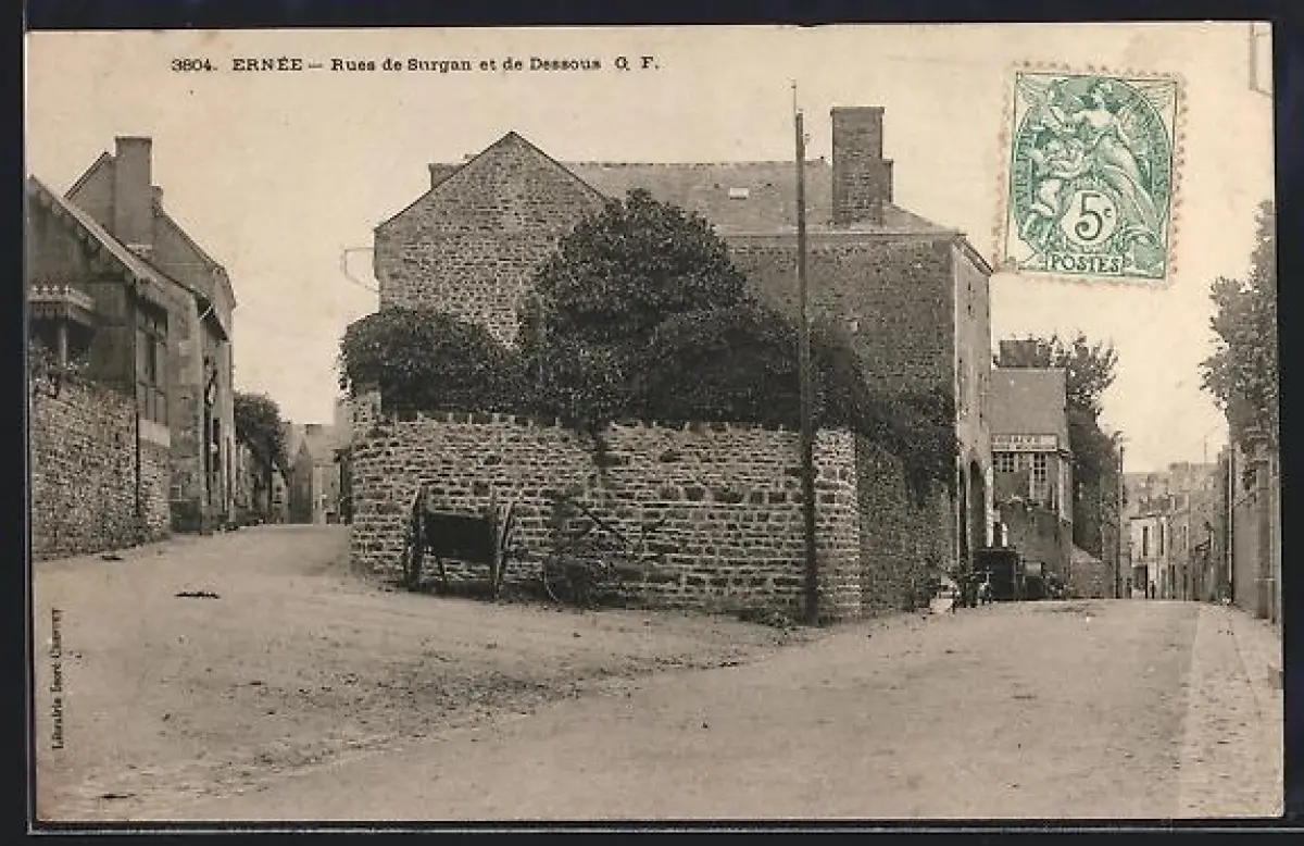 AK Ernée, Rues de Surguet et de Dessous, vue d`une rue pavée avec bâtiments en pierre et charrette