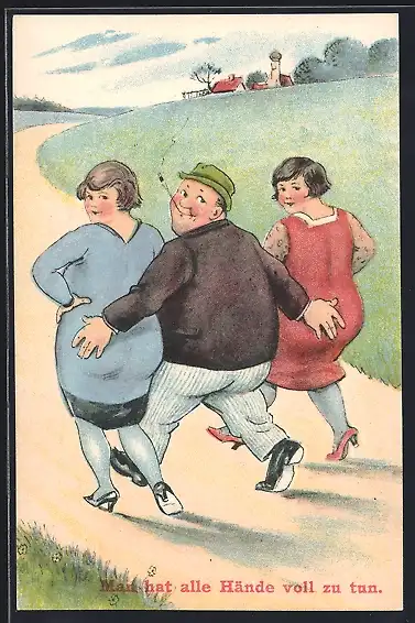 AK Erotik, Ein Mann fasst zwei Frauen beim Spazieren an den Hintern