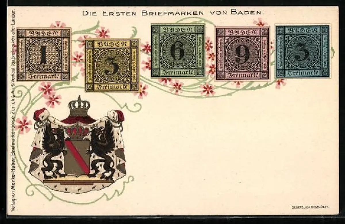 AK Ersten Briefmarken aus Baden, Badisches Wappen