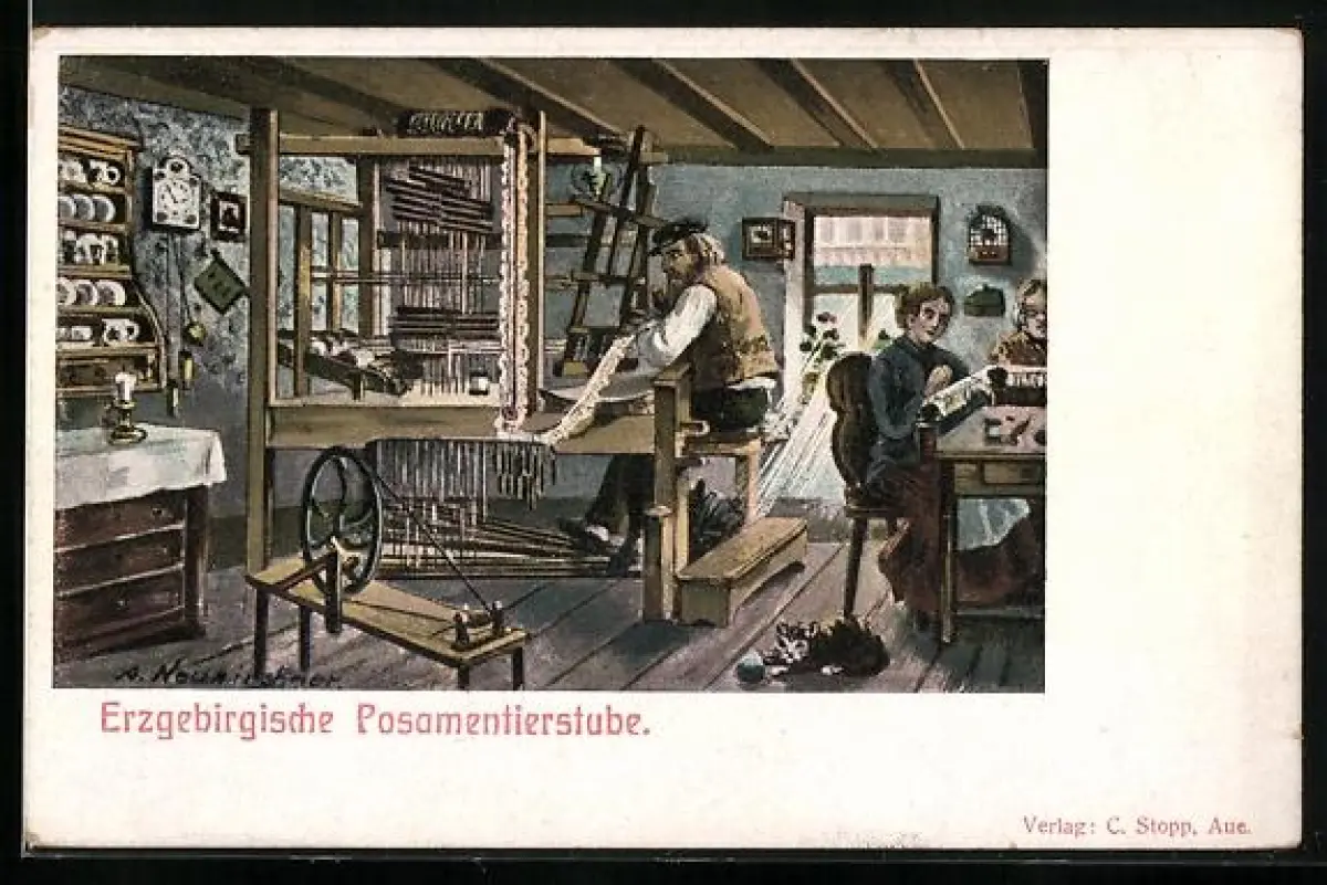 AK Erzgebirgische Posamentierstube, klöppeln, Spinnrad