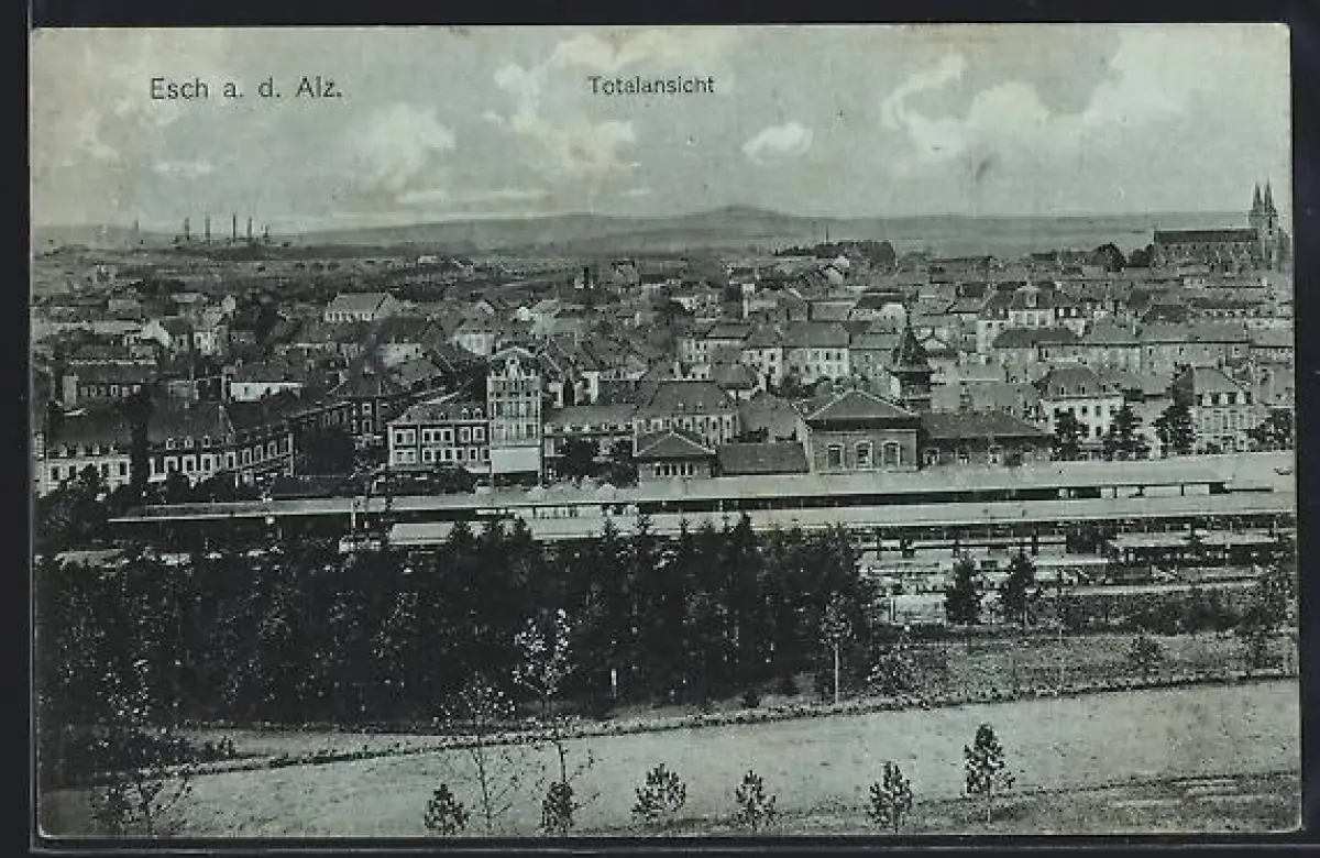 AK Esch a. d. Alz, Totalansicht mit Bahnhof aus der Vogelschau