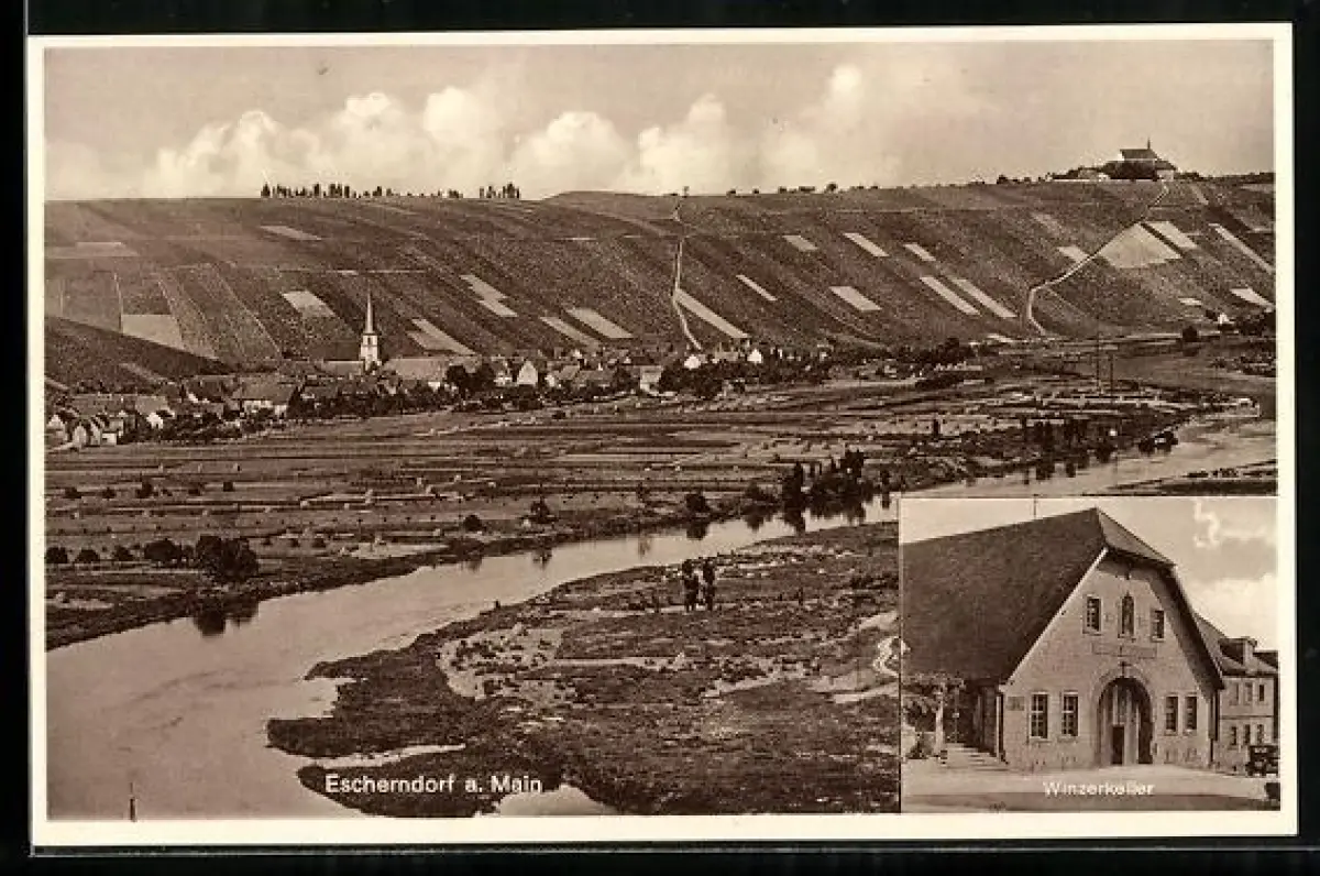 AK Escherndorf a. Main, Gasthaus Winzerkeller, Ortsansicht mit Main und Weinbergen