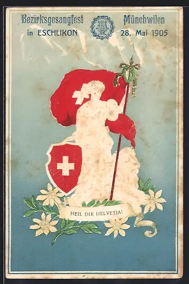 AK Eschlikon /Münchwilen, Bezirksturnfest 28. Mai 1905, Helvetia mit Schweizer Fahne und Wappen neben einem Löwen