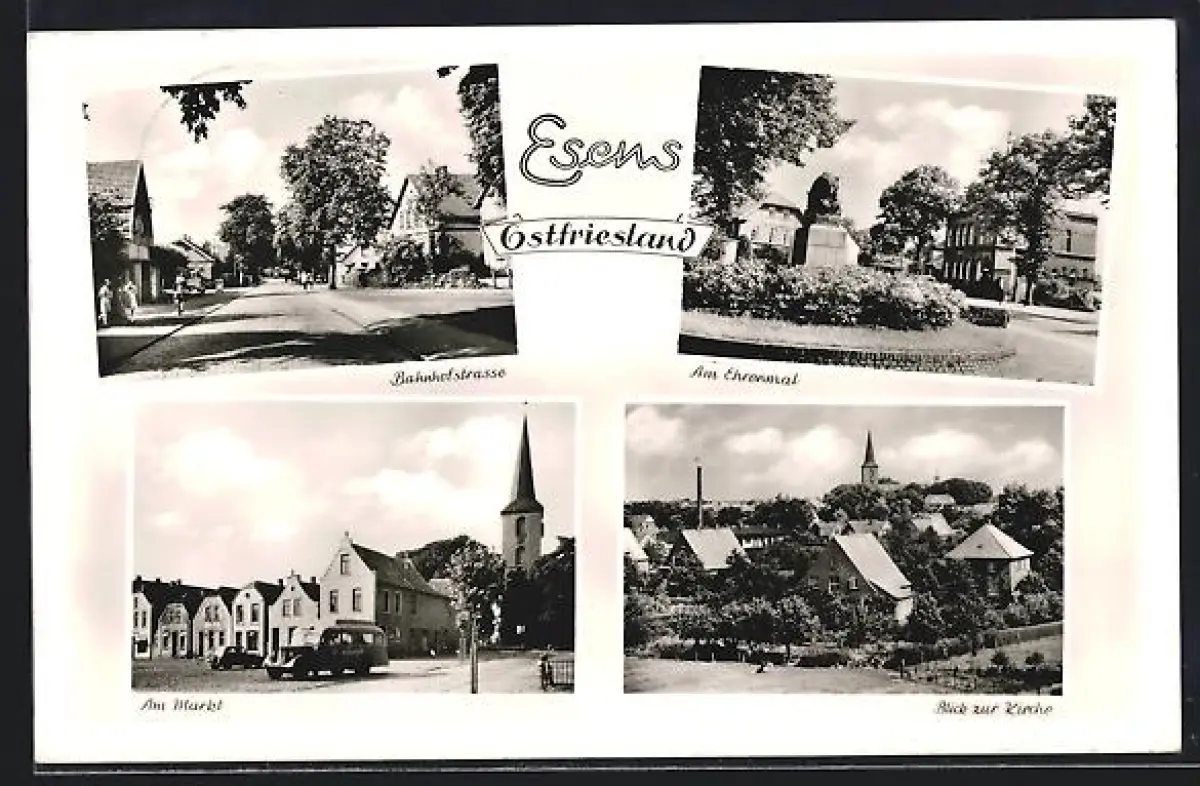 AK Esens /Ostfriesland, Bahnhofstrasse, Am Ehrenmal, Am Markt, Blick zur Kirche