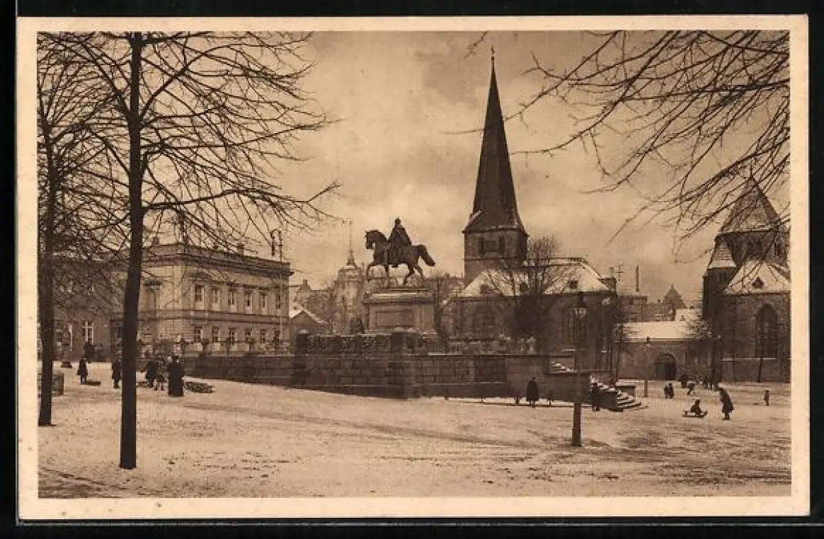 AK Essen, Burgplatz, Reiterstandbild, Kirche