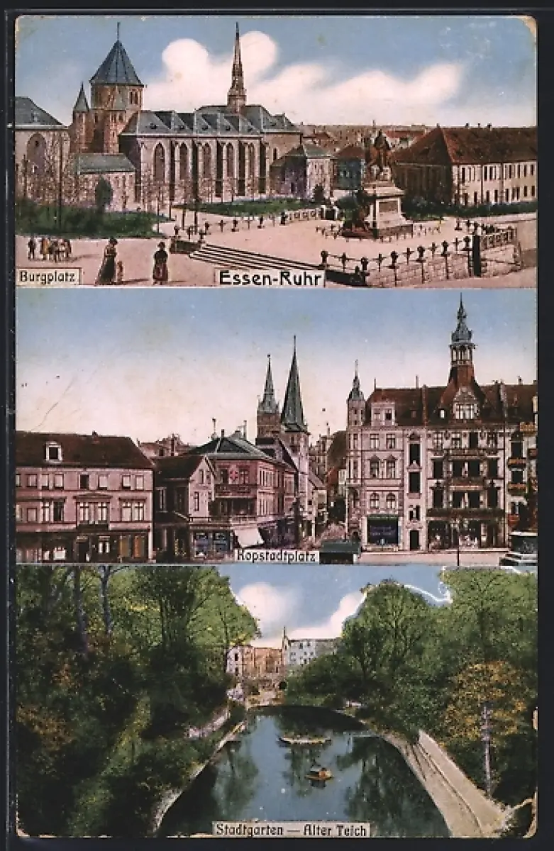 AK Essen-Ruhr, Burgplatz, Kopstadtplatz, Stadtgarten, Alter Teich