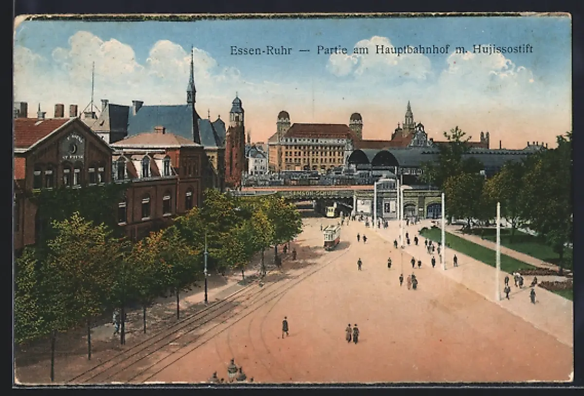 AK Essen-Ruhr, Hauptbahnhof, Hujissostift, Strassenbahnen