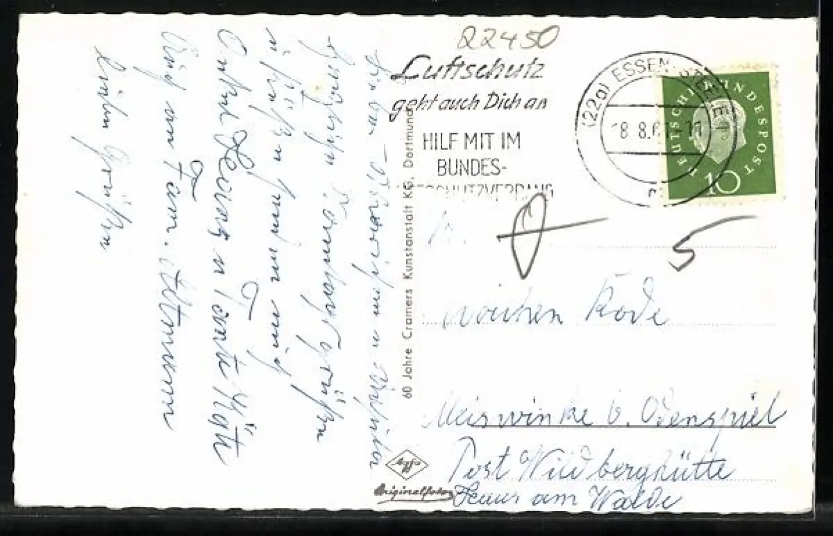 Personenbezogene Daten auf der Rückseite der Karte wurden durch blauen Textmarker unkenntlich gemacht. Die blauen Stellen sind auf die Vorderseite durchgeweicht und wirken sich negativ auf das Postkartenfoto aus