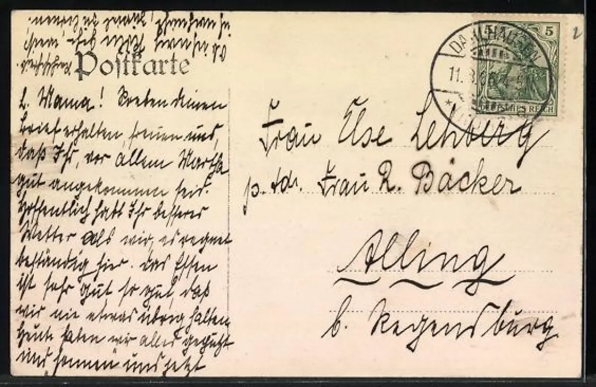 Personenbezogene Daten auf der Rückseite der Karte wurden durch blauen Textmarker unkenntlich gemacht. Die blauen Stellen sind auf die Vorderseite durchgeweicht und wirken sich negativ auf das Postkartenfoto aus
