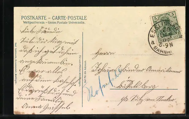 Personenbezogene Daten auf der Rückseite der Karte wurden durch blauen Textmarker unkenntlich gemacht. Die blauen Stellen sind auf die Vorderseite durchgeweicht und wirken sich negativ auf das Postkartenfoto aus