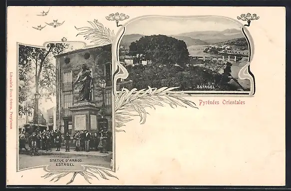 AK Estagel, Vue de la statue d`Arago et du paysage des Pyrénées Orientales