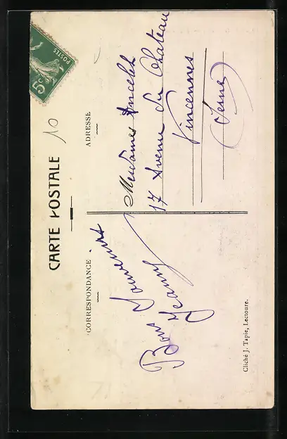 Personenbezogene Daten auf der Rückseite der Karte wurden durch blauen Textmarker unkenntlich gemacht. Die blauen Stellen sind auf die Vorderseite durchgeweicht und wirken sich negativ auf das Postkartenfoto aus