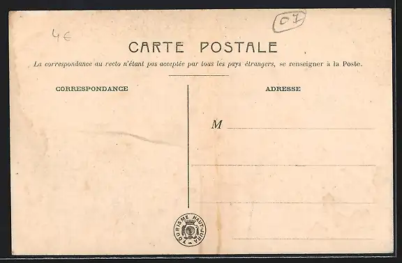 Personenbezogene Daten auf der Rückseite der Karte wurden durch blauen Textmarker unkenntlich gemacht. Die blauen Stellen sind auf die Vorderseite durchgeweicht und wirken sich negativ auf das Postkartenfoto aus