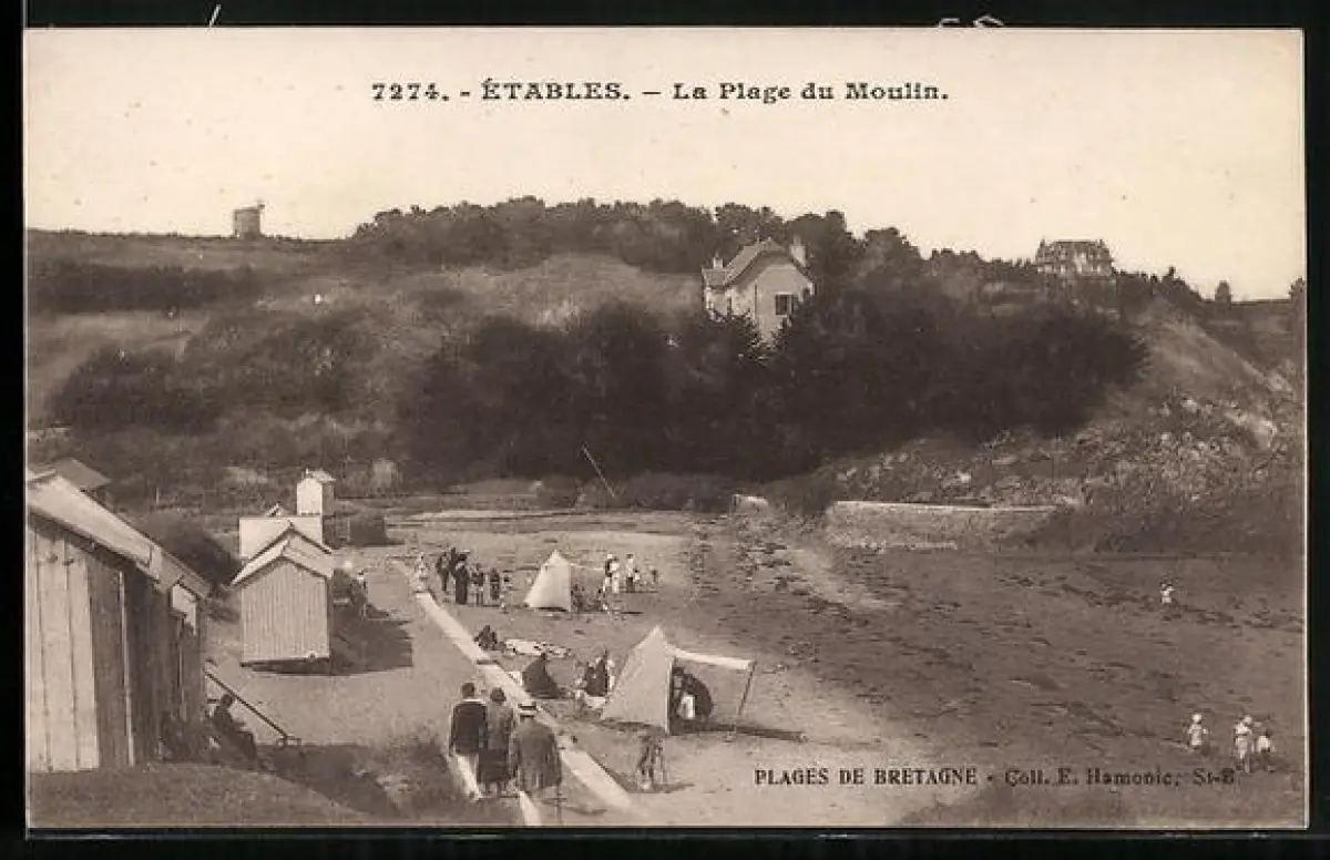 AK Étables, La Plage du Moulin avec baigneurs et cabines sur la côte bretonne