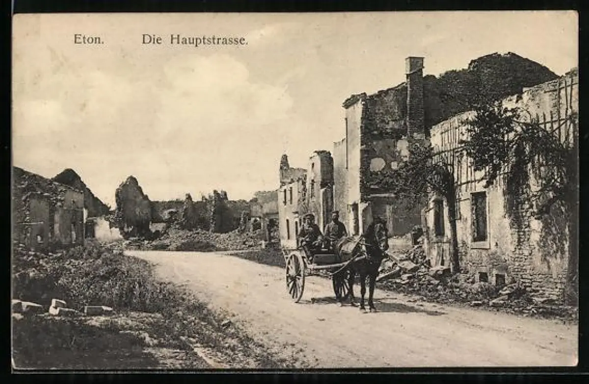 AK Éton, La rue principale avec charrette et bâtiments en ruine