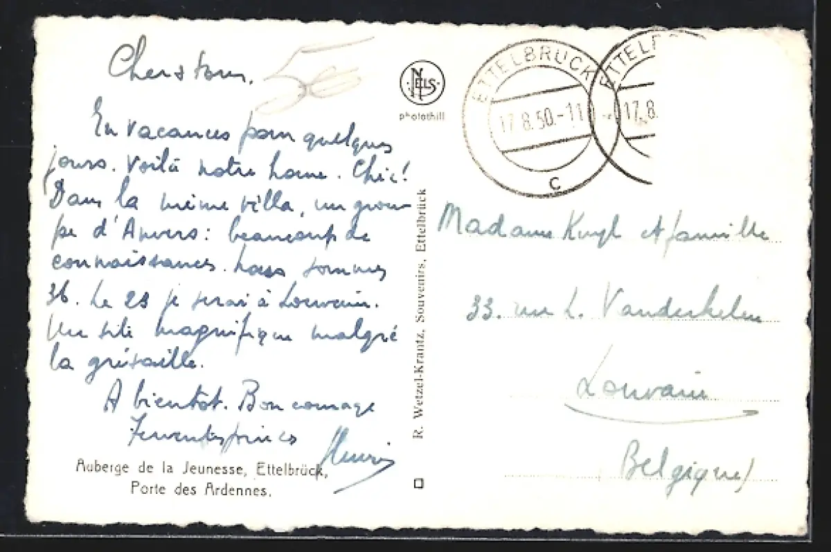 gelaufen 1950, Briefmarke entfernt, Eckknick u. kl. Eckschaden oben li., Stempelspur, guter Zustand
