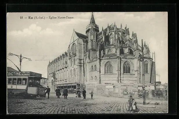 AK Eu, Eglise Notre-Dame, Strassenbahn