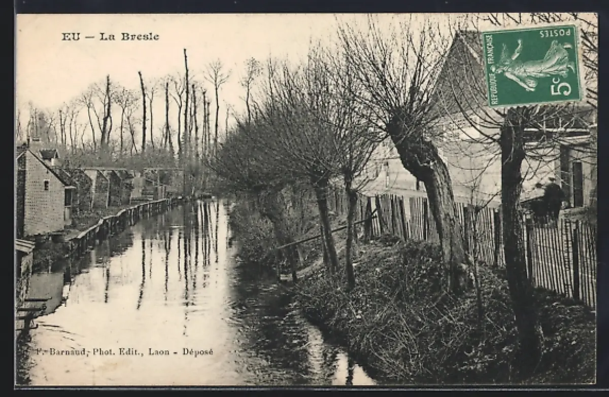 AK Eu, La Bresle avec maisons bordant la rivière et arbres dénudés