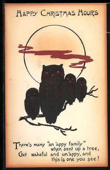 AK Eulenfamilie auf einem Zweig, Weihnachtsgruss