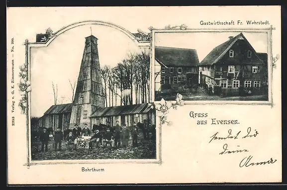 AK Evensen, Gasthaus Fr. Wehrstedt, Öl-Bohrturm