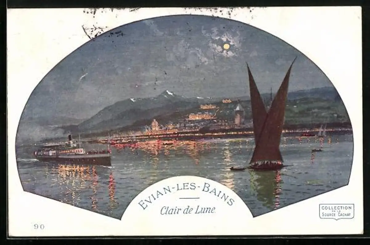 AK Evian-les-Bains, Clair de Lune, Segelboot und Dampfschiff