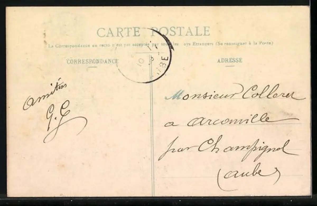 Personenbezogene Daten auf der Rückseite der Karte wurden durch blauen Textmarker unkenntlich gemacht. Die blauen Stellen sind auf die Vorderseite durchgeweicht und wirken sich negativ auf das Postkartenfoto aus