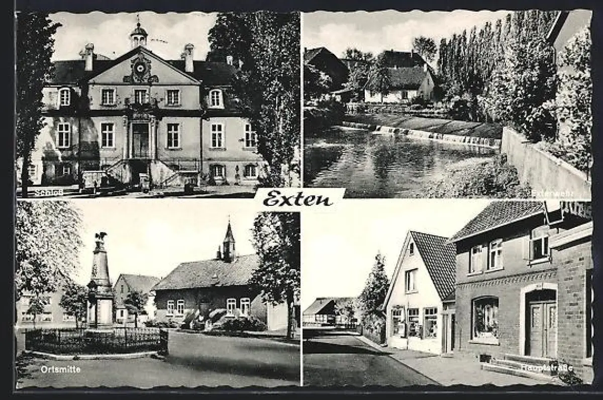 AK Exten, Exterwehr, Schloss, Hauptstrasse, Partie in der Ortsmitte mit Kriegerdenkmal