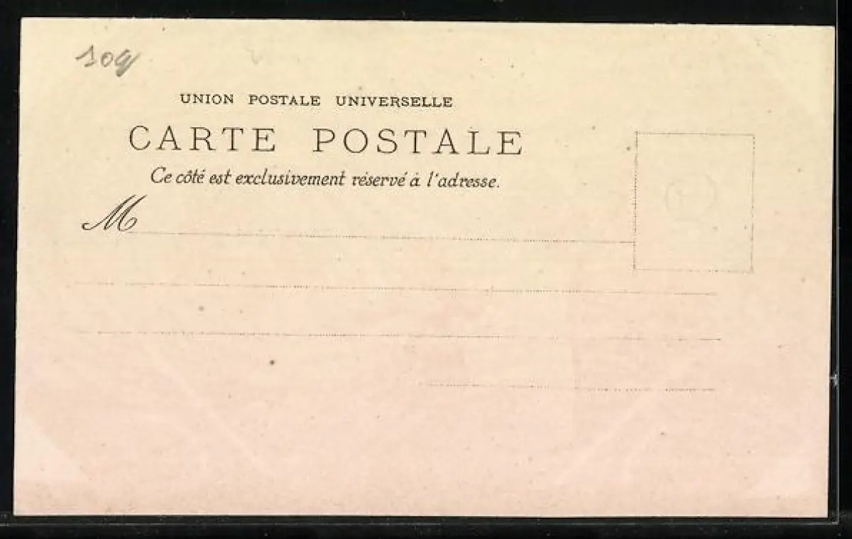 Personenbezogene Daten auf der Rückseite der Karte wurden durch blauen Textmarker unkenntlich gemacht. Die blauen Stellen sind auf die Vorderseite durchgeweicht und wirken sich negativ auf das Postkartenfoto aus