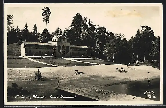 AK Faak am See, Insel-Strandbad mit Badegästen