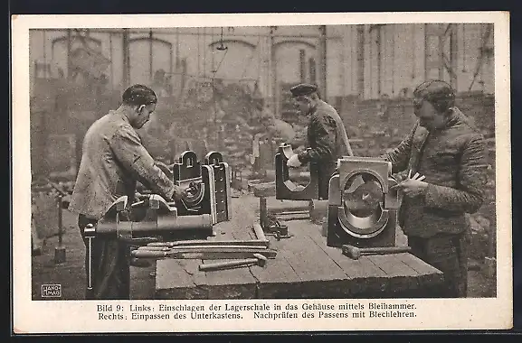 AK Fabrikarbeiter beim Einschlagen der Lagerschale in das Gehäuse