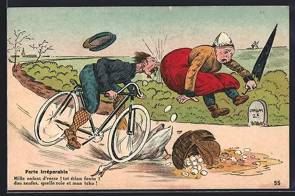 AK Fahrradfahrer überfährt Gans von Frau mit Eierkorb, Scherz