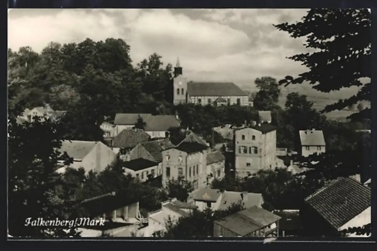 AK Falkenberg /Mark, Ortsansicht mit Kirche und Wohnhäusern