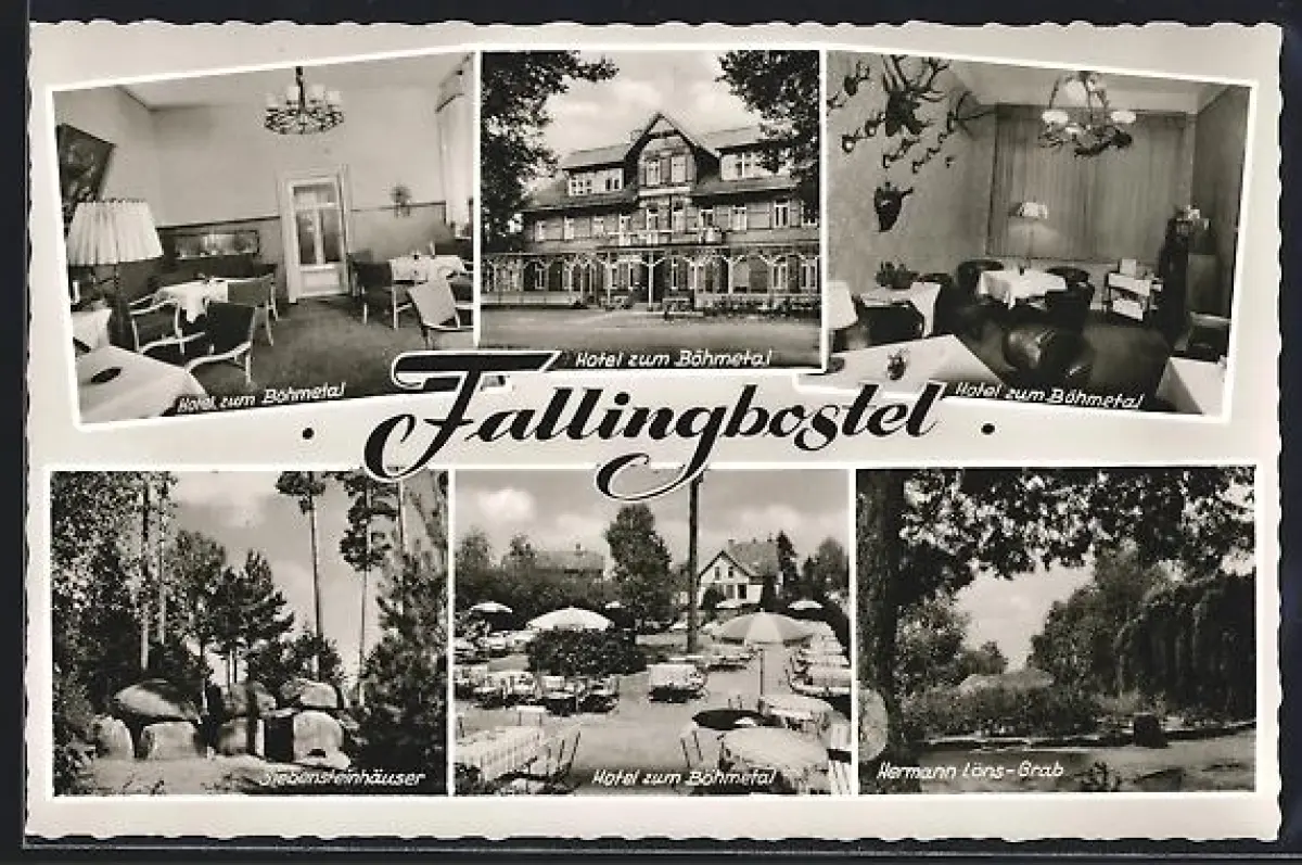 AK Fallingbostel, Hotel zum Böhmetal, Siebensteinhäuser, Hermann Löns-Grab