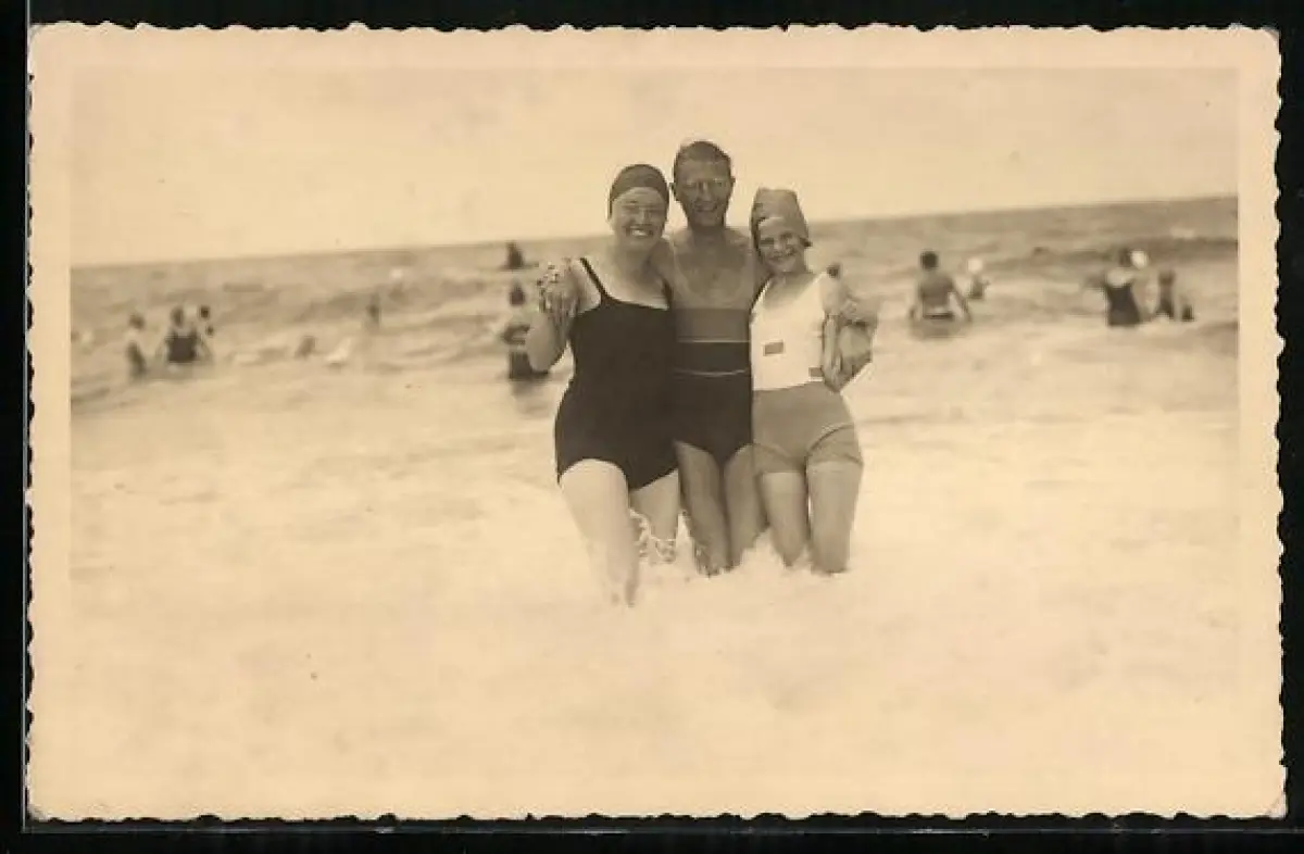 AK Familie in Badekleidung in aufgewühlter See am Ufer