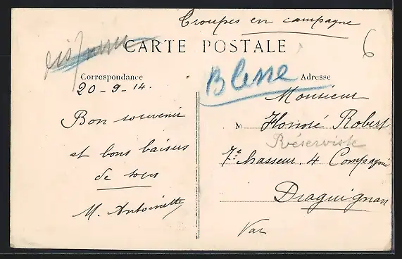 Personenbezogene Daten auf der Rückseite der Karte wurden durch blauen Textmarker unkenntlich gemacht. Die blauen Stellen sind auf die Vorderseite durchgeweicht und wirken sich negativ auf das Postkartenfoto aus
