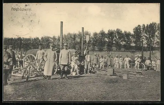 AK Feldbäckerei mit fahrbaren Feldbacköfen, Soldaten in Uniform